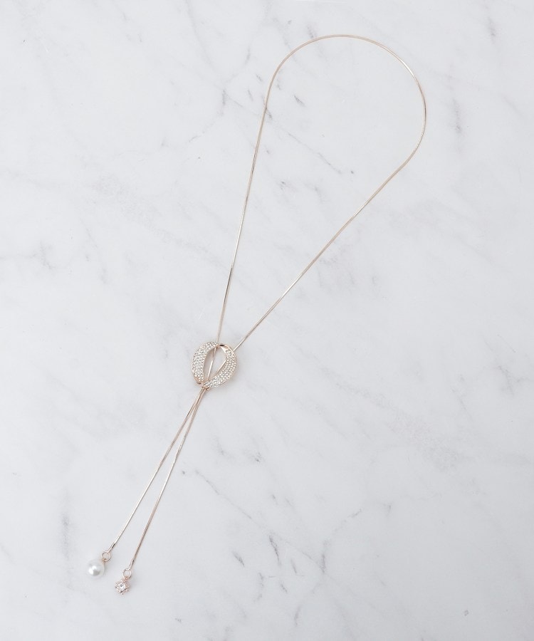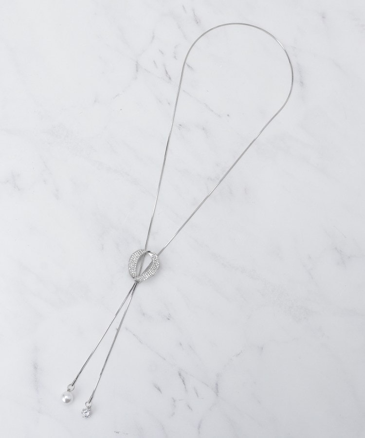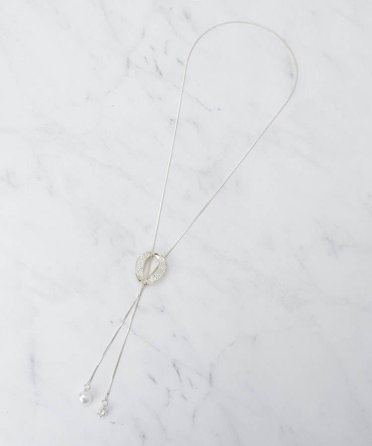 【デザイン】表面を細かなパヴェで覆ったオープンループが主役のネックレス。ループにダブルの細チェーンを通すことでモチーフが自由にスライドし、チェーン先端の爪留めクリスタルとフェイクパールが揺れて繊細な動きを生み出します。洗練された光沢と軽やかなフォルムが同居するデザインです。【コーディネート】上品なデザインなのでオンからオフまで幅広いニーズに活躍できるかと思います。【おすすめポイント】スライドパーツでお好みのバランスに調整可能。【カラー】 005 ピンクシルバーカラーメッキ006 シルバーカラーメッキ007 ゴールドカラーメッキ※照明の関係により、実際よりも色味が違って見える場合があります。また、パソコン・スマートフォンなどの環境により、若干製品と画像のカラーが異なる場合もございます。