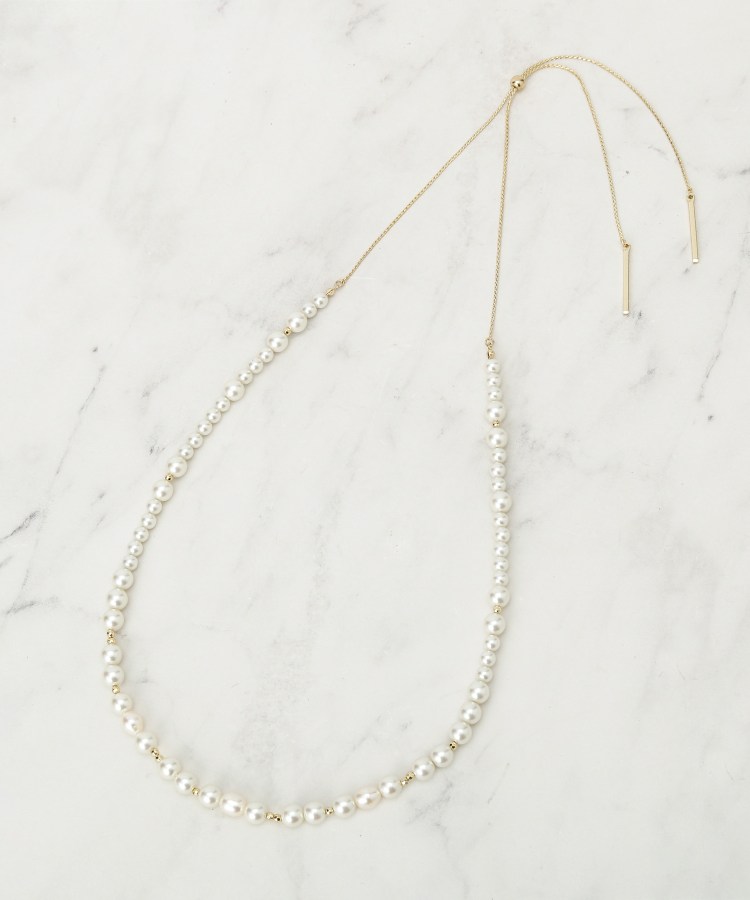 【デザイン】艶やかな人工パールをベースに、ランダムに配した淡水パールがアクセントになったロングネックレス。スライダー式のポールで簡単に長さを調節でき、短めにして胸元のワンポイントにしたり、ロングのまま前後を入れ替えてラリエット風に垂らしたりとシーンや気分でスタイルチェンジが可能です。セレモニーやフォーマルシーンはもちろん、普段使いにもアレンジしやすいデザインになっています。※照明の関係により、実際よりも色味が違って見える場合があります。また、パソコン・スマートフォンなどの環境により、若干製品と画像のカラーが異なる場合もございます。
