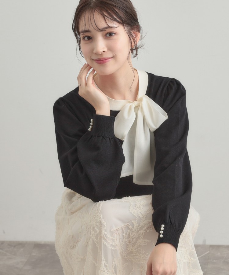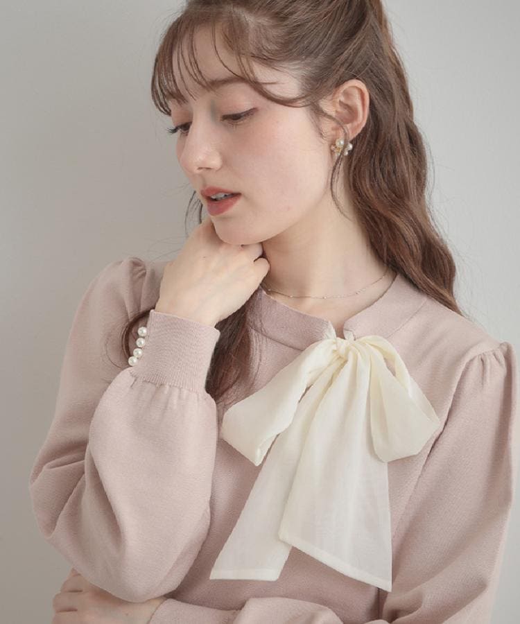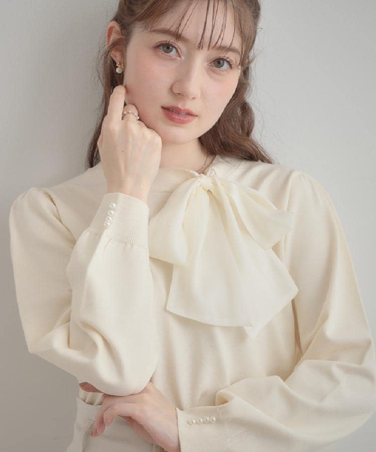 【デザイン】首元のシフォンリボンが目を惹くデザインニット。ふんわりとしたリボンは上品なボリューム感がありつつ、一枚で顔周りを明るく華やかに見せてくれます◎【素材】きめ細やかな編地ならではのなめらかな肌触りと上品な落ち感が特徴。※ハンドウォッシャブル機能付き※照明の関係により、実際よりも色味が違って見える場合があります。また、パソコン・スマートフォンなどの環境により、若干製品と画像のカラーが異なる場合もございます。