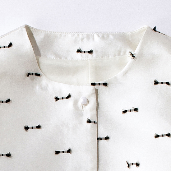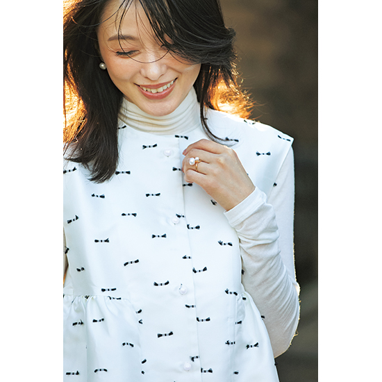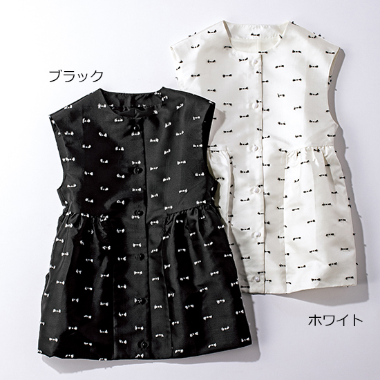 光沢のあるジャカード素材にミニリボンのようなデザインを施した華やかなジレ。