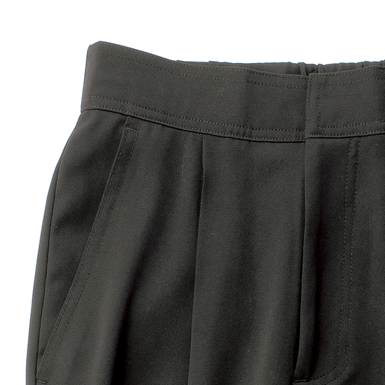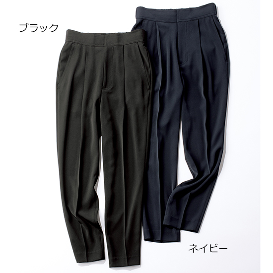 ウエストタック、センタープレス入りで細めのテーパードシルエット。