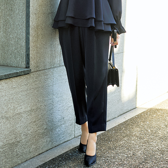 <p><font color=#c31941 size=3>お仕事、保護者会、ママ友ランチ… … <br>セレモニー後も絶対に使える 大人の甘さが引き立つ極上セット</font><br><br>ウエストタック、センタープレス入りで細めのテーパードシルエット。<br>ウエストは前開きのきちんとデザインに見えて、後ろゴム仕様で履き心地もラク。<br>両脇と後ろにポケット付き。シワになりにくい素材で洗濯可能。同素材のブラウスとセットアップ可能。<br><br>脚をまっすぐに見せるセンタープレスパンツ。<br>式や仕事だけでなく、ブラウスを合わせた甘ニッシュコーデならママOFFでも着られる。<br>自宅でのイージーケアで、スタメンパンツとしても活躍。<br><br>【POINT】<br>・リッチに揺れる上質素材をふんだんに使用したペプラムデザイン<br>・まとめ髪が華やぐクルミボタンの飾りをON<br><br><font size="3">ALEA(アレア)</font><br>読者の意見を反映したSTORY発ブランド。<br>仕事や育児、送迎に忙しい多スクな大人に向けたデザインに。<br><br>撮影/須藤敬一(モデル)、清藤直樹(静物)<br>モデル/徳澤直子[身長:170cm]、ヘア・メーク/川村友子<br>スタイリスト/中西雛乃(Ash.)</p>