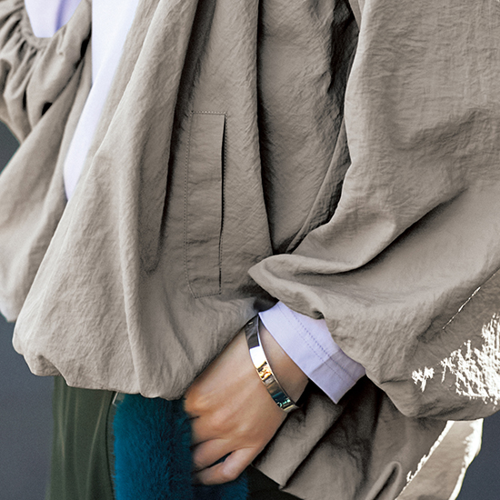 袖口と、裾がバルーンになったブルゾンは、撥水素材を使用。<br />