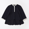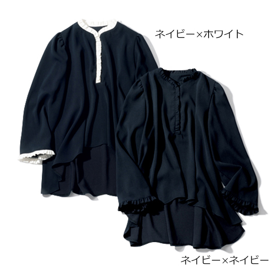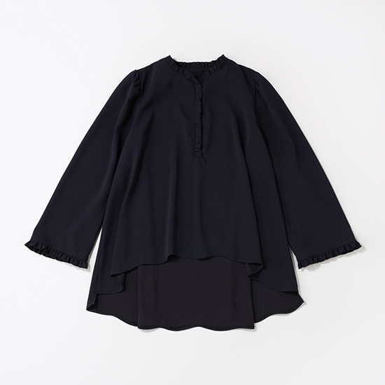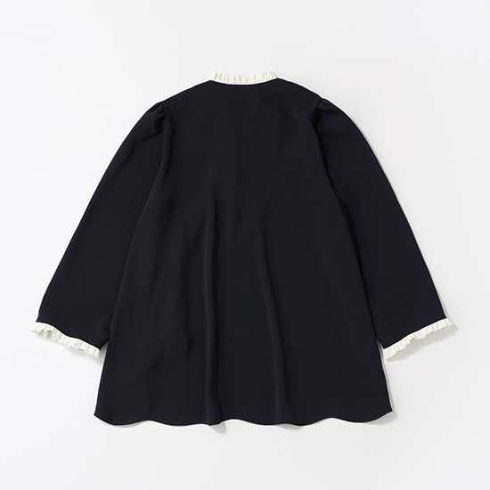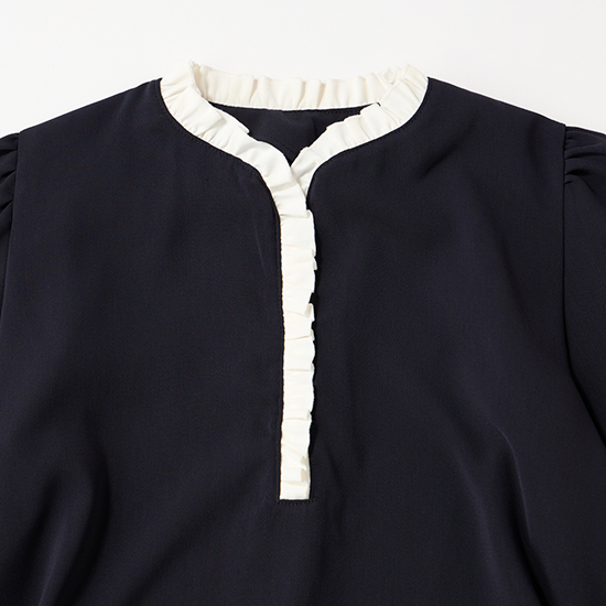 首元から前立てにかけてミニフリルがあしらわれたフレアブラウス。