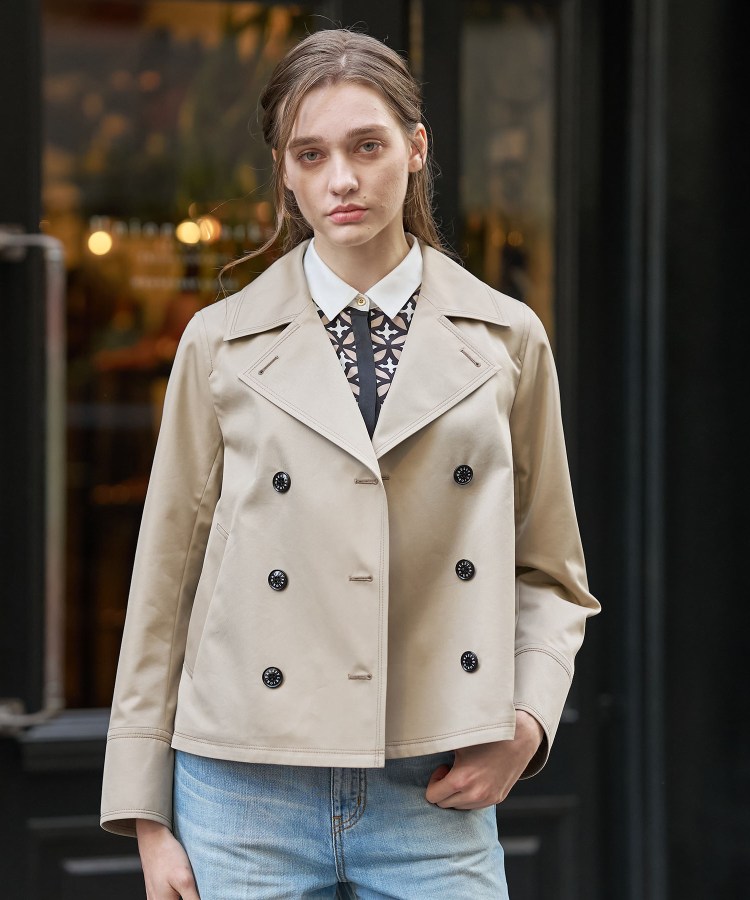 【Aラインシルエットが魅力のショートトレンチジャケット】ご好評いただいている春の新定番、Aラインのトレンチジャケット。撥水加工を施した素材を使用しており、見た目の美しさだけでなく、機能性も高い頼れるジャケットに仕上げています。●本格的なトレンチディテールをしっかりと押さえつつ、見返し部分にはオリジナルの「オーバーラッププリント」を採用。●シルエットは裾に向けて広がるAラインデザインを採用しているため、女性らしい柔らかな印象を演出します。●春のアウターとして、さまざまなコーディネートに活躍する一着です。●こだわり縦糸には綿、緯糸にはポリエステルを組み合わせた素材を使用。ベージュカラーは素材ごとに染め分けし、角度によって上品な玉虫調の色合いが楽しめます。『ギャバジン』と呼ばれる織り目の詰まった丈夫な綾織の生地を採用し、綿100%の素材に比べてシワになりにくく、きれいな表情が持続する点も特徴です。裾に向かって広がるAラインのシルエットですが、バスト部分は立体的に、肩まわりは華奢に見えるようパターンにこだわって丁寧に仕上げています。絶妙なバランスで、着る人を美しく引き立てるデザインです。また、適度なハリ感と滑らかな質感があり、上品な印象を保ちながらも動きやすい仕上がりに。ヒップを隠すショート丈の着丈感は、さまざまなボトムスと合わせやすく、新しいバランスでのコーディネートが楽しめます。さらに、ベージュカラーには配色のロゴ入り釦を取り入れ、全体のデザインを引き締めてスタイリッシュな印象をプラス。羽織るだけでフレンチシックな上品さが漂い、気軽にこなれたスタイルが完成する一枚です。※照明の関係により、実際よりも色味が違って見える場合があります。また、パソコン・スマートフォンなどの環境により、若干製品と画像のカラーが異なる場合もございます。