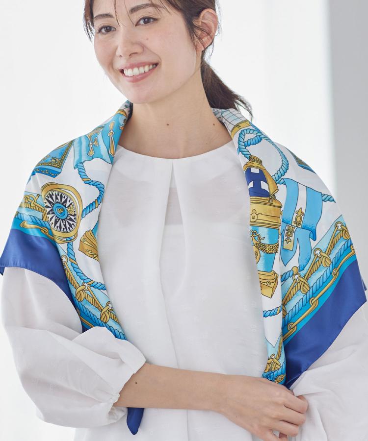 【デザイン】90×90cmの大判スクエアスカーフ。イタリアでつくられたエレガントな柄と色使いがコーディネートの主役になり、シンプルな装いに華やかさをプラスしてくれます。程よいボリュームがあるため腰に巻いてスカート感覚で使ったり、肩に羽織ってストール代わりにするなど自由なアレンジが楽しめます。ポリエステルの扱いやすさもポイントです。※照明の関係により、実際よりも色味が違って見える場合があります。また、パソコン・スマートフォンなどの環境により、若干製品と画像のカラーが異なる場合もございます。