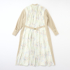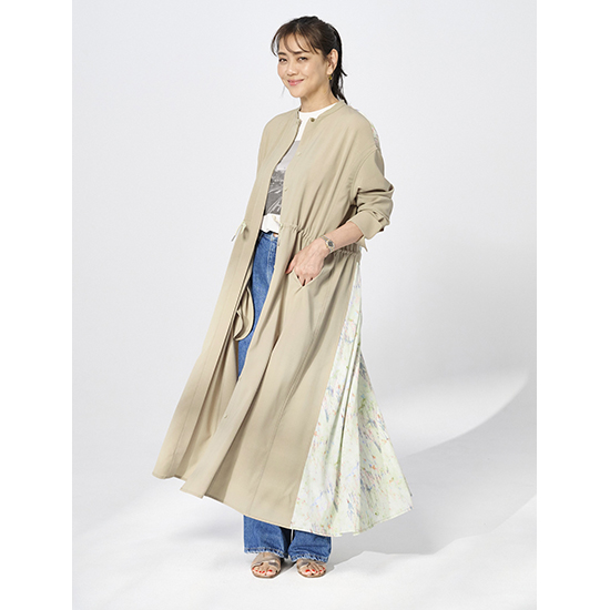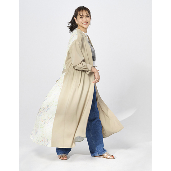 オリジナルのプリント生地をドッキングさせたコートワンピース。