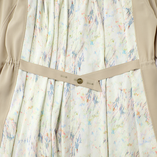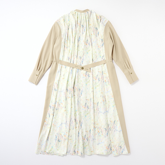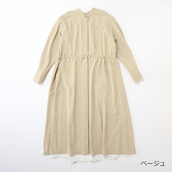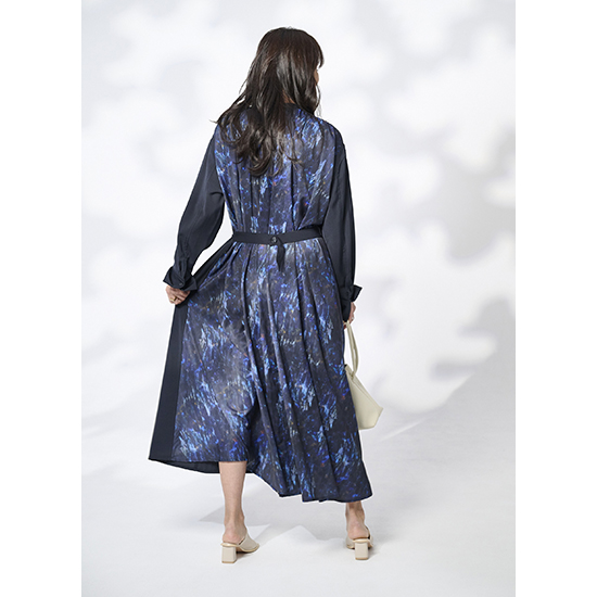 <p><font color=#c31941 size=3>オリジナルのプリント生地をドッキングさせたコートワンピース。</font><br><br>無地とプリントのコントラストがモードな存在感を放ち、一枚で着映えするデザインに仕上げています。<br><br>フロントを開ければライトコートとして、閉じればワンピースとして着られる2WAY仕様。<br>ウエストをシェイプさせることでスタイルアップ効果もあり、女性らしさとモード感を兼ね備えています。<br>らりと羽織るだけで、特別感を演出してくれる万能アイテム。デイリーからお出かけ、オケージョンまで幅広く活躍します。</p>
