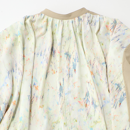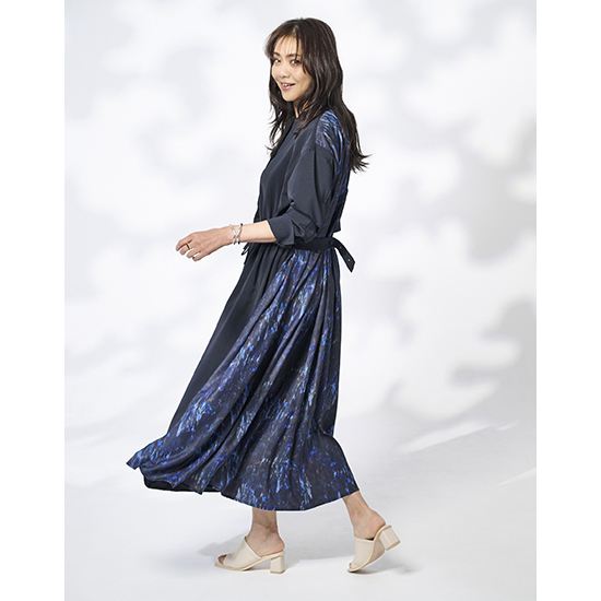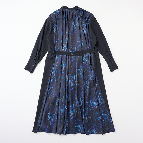 無地とプリントのコントラストがモードな存在感を放ち、一枚で着映えするデザインに仕上げています。