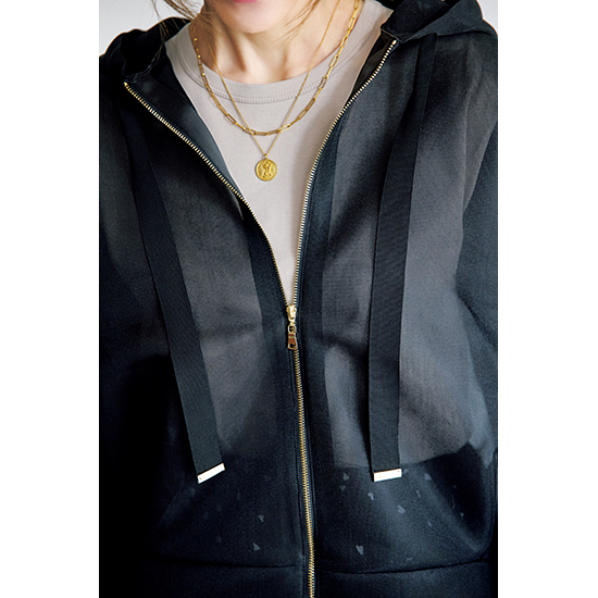 <p><font color=#c31941 size=3>甘さもトレンドも、今が〝アプデ〟のタイミング!<br>春のオシャレがうまくいく!</font><br><br>「何度着ても飽きない」、「気づくと手に取っている」多彩さ<br>手持ちの服のポテンシャルを上げ、心地よく着られる。<br><br>あせないベーシックにひとつだけヒットなトレンドをミックス<br><br>ちょっと羽織るのに今から夏まで使え、寒いうちは重ね着に一役買い、オシャレに<br>余韻を残してくれるシアーなフーディです。<br>裏毛のフーディと違い透け感のあるダンボール素材は何より軽い。<br>さらに構築的なシルエットをつくりやすくスタイリッシュさが倍増します。<br>スピンドルの代わりにリボン、ゴールドファスナーに金具でエレガントささえあるのが大人仕様です。<br><br>【POINT】<br>・ゆるやかな前後差でヒップもカバー<br>・リボン×ゴールド金具で女っぽさ倍増<br>・裾タックのふんわり感で脱・カジュアル<br><br><font size="3">SECRET TROPHY(シークレットトロフィー)</font><br>ベーシックに軸を置きながらも、シンプルだけど地味にならず必然的にコーデが整う<br>アイテムが揃うのがシークレット・トロフィー、通称シートロです。<br>大人のシンプルすぎると間が持たないを解決しながらも、日々手に取りやすいアイテムが中心です。<br><br>撮影/曽根将樹(PEACE MONKEY)<br>(モデル)清藤直樹(静物)モデル/美香 <br>ヘア・メーク/森ユキオ(ROI)<br>スタイリスト/井関かおり</p>