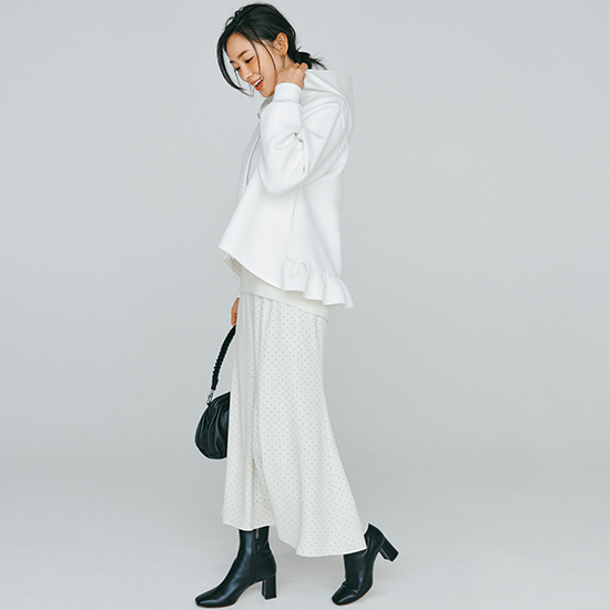 裾にあしらったフリルの甘さで、カジュアル服が苦手な人でも取り入れやすい