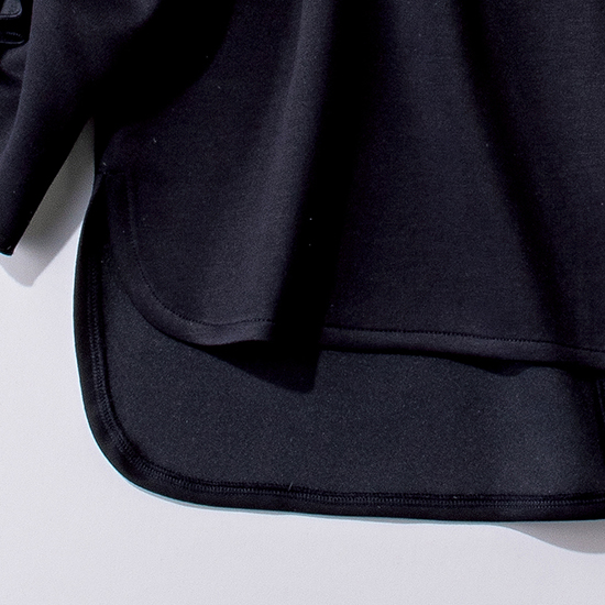 お尻をカバーできるバックロングとサイドスリットで、裾をインしてもアウトしても着こなしがキレイに決まります。