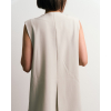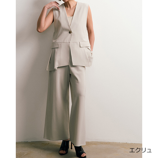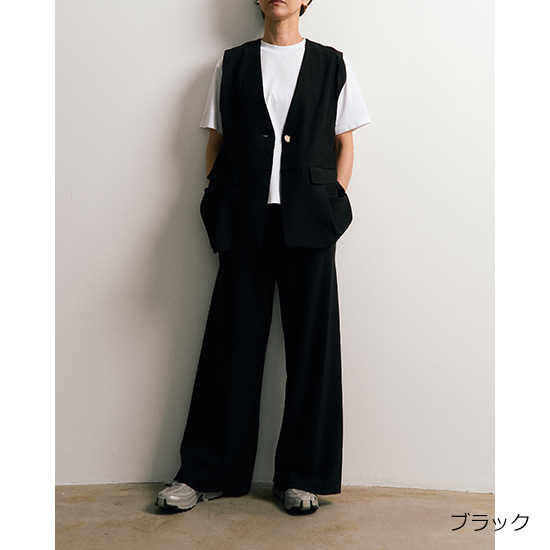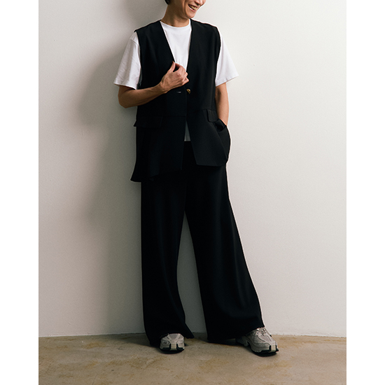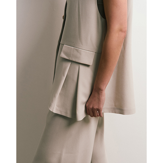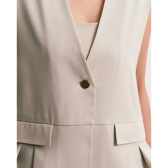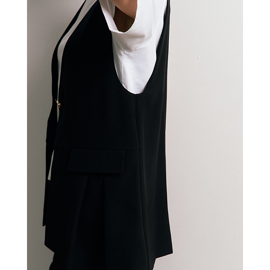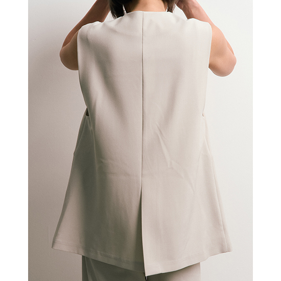 フロントの切り替えとタックデザインがさりげなく、単調にならないアクセントを加えたノーカラーベスト。