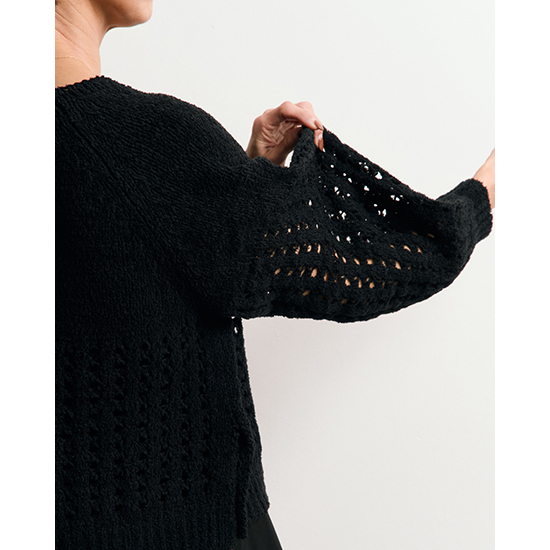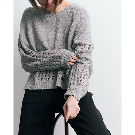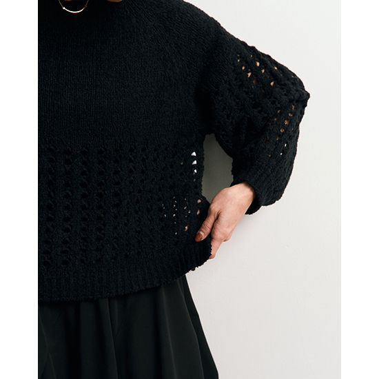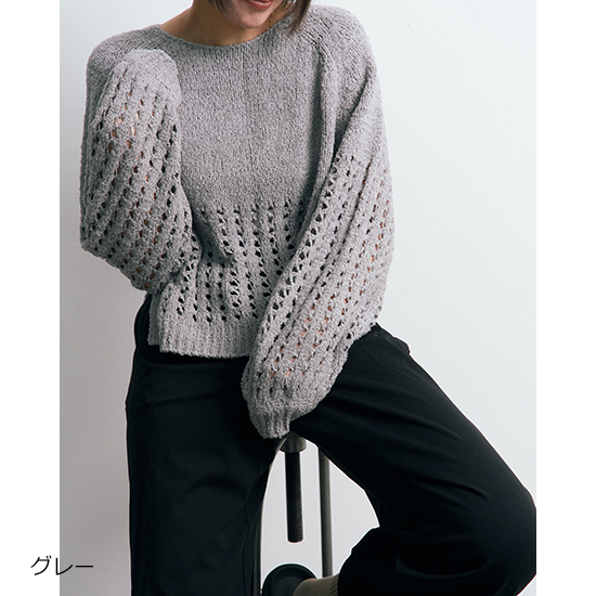 メッシュのような編地が、抜け感と軽やかさを演出した編みニットプルオーバー。