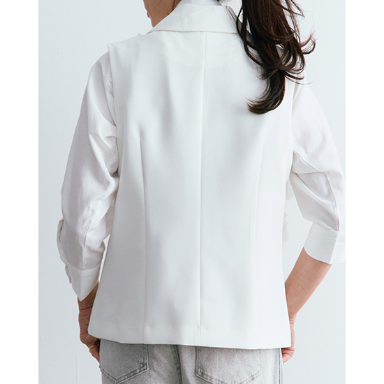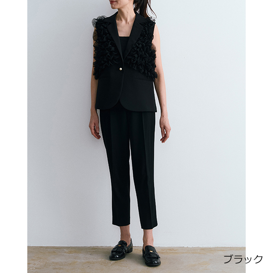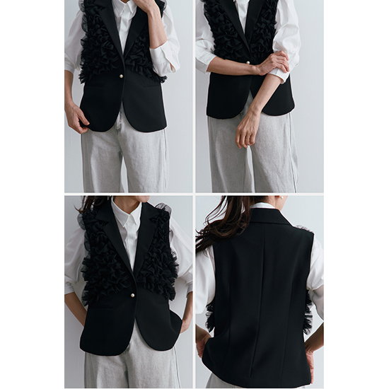 <p><font color=#c31941 size=3>洒落感たっぷりでエレガントなチュールジレ</font><br><br>ほんのりストレッチのある生地を使用。<br>柔らかくさらりとした肌触りで快適な着心地が感じられます。<br>フロントに立体感のあるチュールを施す事で華やかさをプラス。<br>パールボタンを採用する事でより上品さが引き立ちます。<br>同色のチュールなので落ち着いた雰囲気でまとまり、甘すぎないのもポイント。<br>軽やかなチュール素材をドッキングしカチッとしすぎない柔らかい印象に。<br>女性らしさを纏ったどんなコーデにも馴染む万能アイテムです。</p>