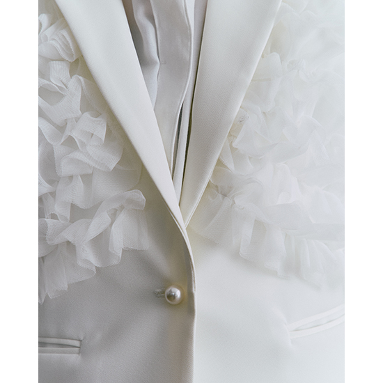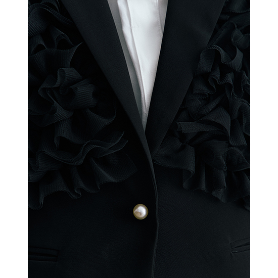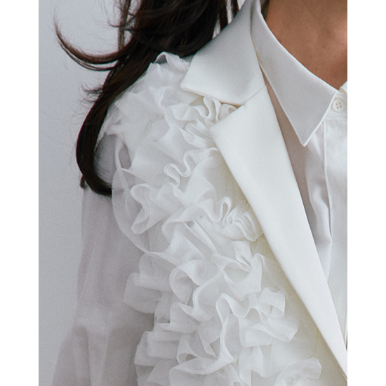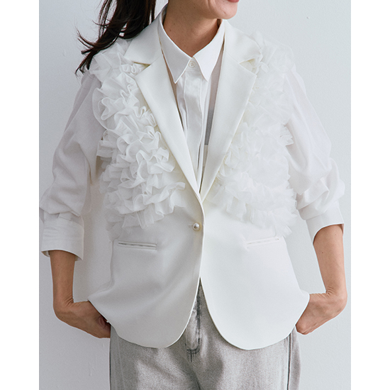 軽やかなチュール素材をドッキングしカチッとしすぎない柔らかい印象に。