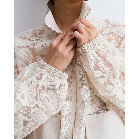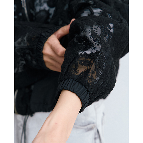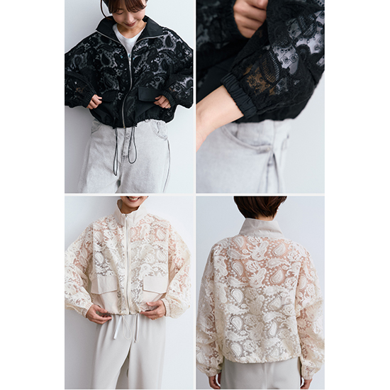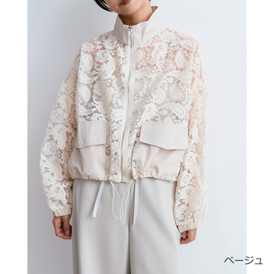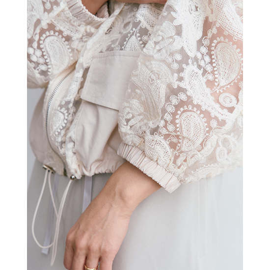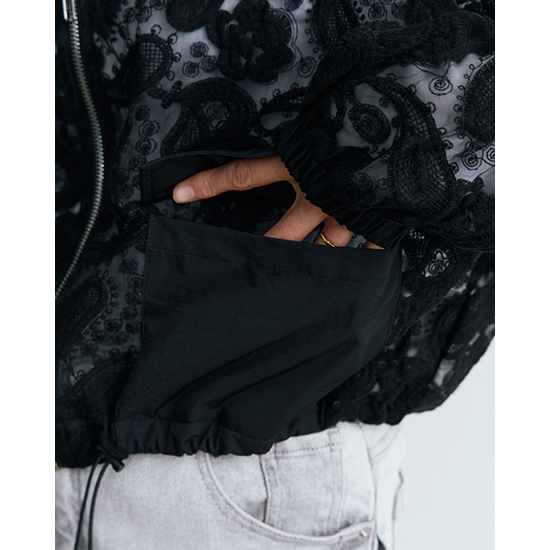 透け感のある刺繍レース生地とサテン素材を組み合わせたブルゾンです。手洗い可能です。