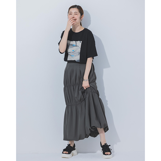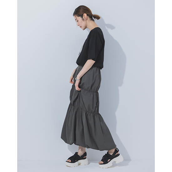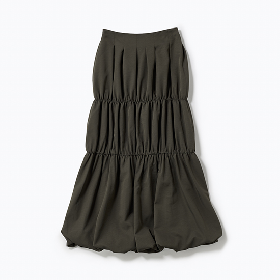 タックを効かせたバルーンシルエットが、動くたびに立体的な表情を演出するロングスカート。