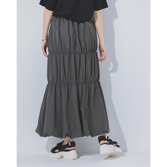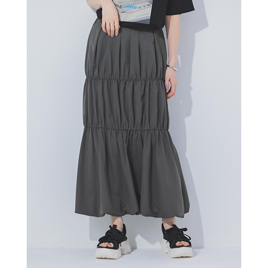 タックを効かせたバルーンシルエットが、動くたびに立体的な表情を演出するロングスカート。<br />