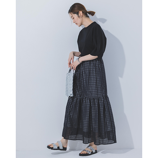 柄× 透け感のレイヤードが効いているから、トップスはシンプルでも着映えするアイテムです。