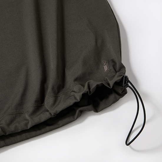 ■定番ロングセラーのギャザーTシャツ(プチリニューアル)・裾部分に生地分量をもたせ、内側にドローコードをつけサイズ調節・立体的なギャザーバルーンシルエット・肩回りの後ろラグラン、袖のテーパード、襟の共生地で、首・肩・袖はスッキリ見えるデザイン・5分袖で二の腕カバー・ジャケットインにも上品な、布帛ブラウス感覚で着用可