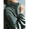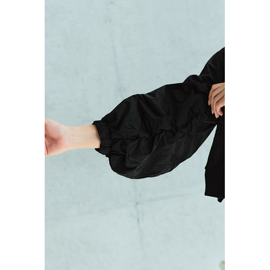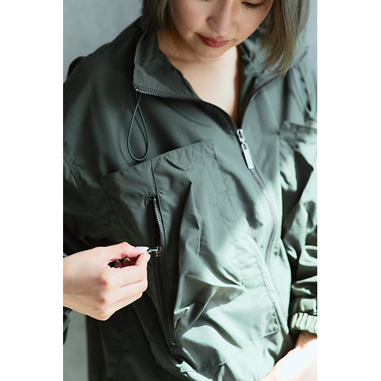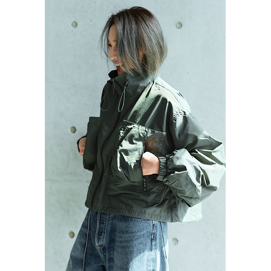 胸元の立体ビッグポケットと、袖内側のギャザーが生むボリュームスリーブが程よい存在感をプラス。裾と襟元はドロスト仕様で、絞れば丸みのある女性らしいフォルムにも。
