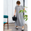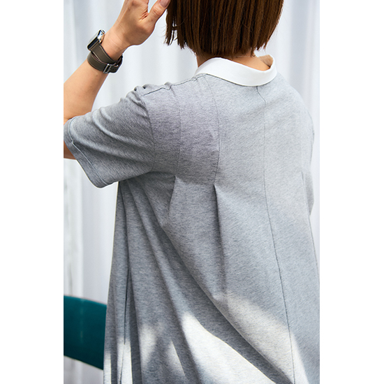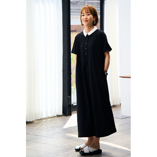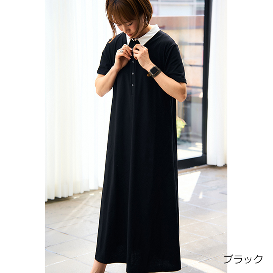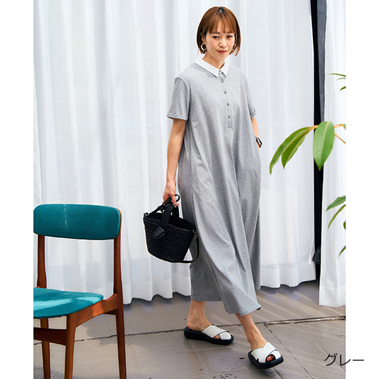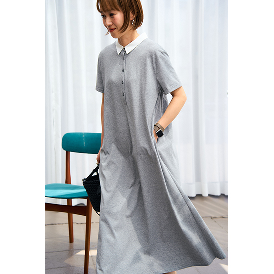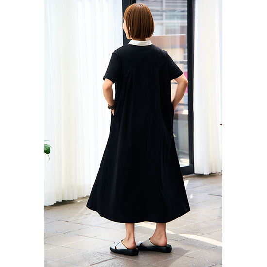衿を配色にしたポロデザインのバックタックワンピース。
