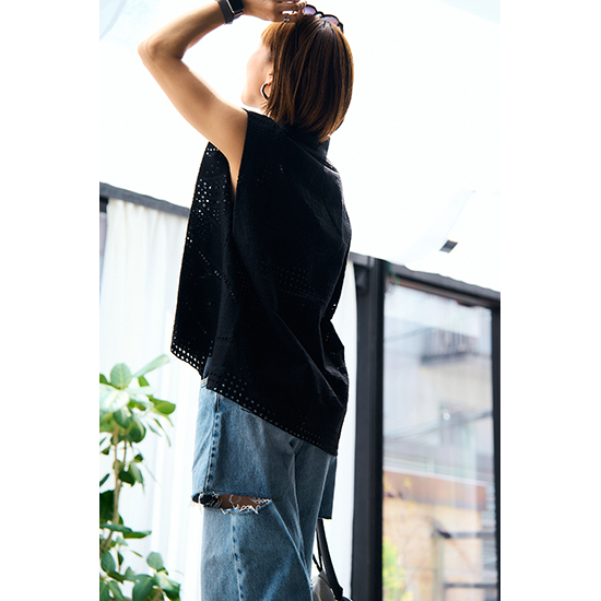 前開き仕様なので、1枚着としてはもちろん、羽織りとしても活躍。タンクトップやキャミソールとレイヤードすることで、レースの透け感を楽しめるのも魅力です。