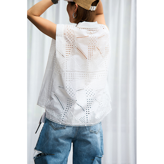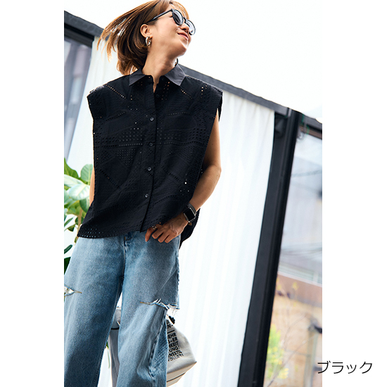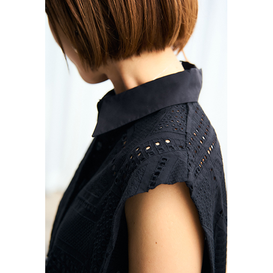 繊細なカットワークレースが目を惹く、存在感たっぷりのデザインシャツ
