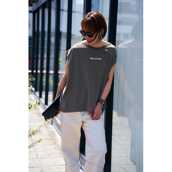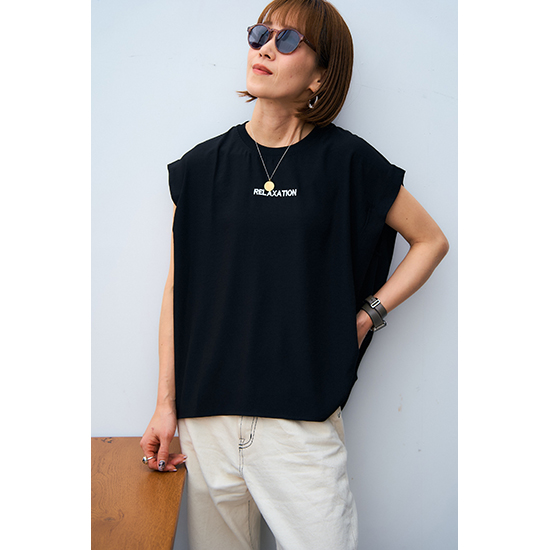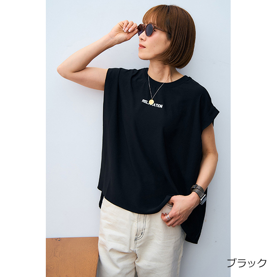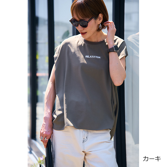 <p><font color=#c31941 size=3>シンプルながらも胸元のロゴ刺繍がアクセントになった、大人カジュアルなフレンチスリーブトップス</font><br><br>肩まわりをさりげなくカバーするフレンチスリーブデザインで、二の腕をすっきり見せてくれるのがポイントです。<br>ゆったりとした身幅と程よく広がるシルエットで、体のラインを拾いにくくリラックス感のある着心地に。前後差のある着丈で、パンツにもスカートにも合わせやすく、バランスよくスタイリングが決まります。ポリエステル素材で軽く、さらっとした肌触りも魅力。デイリー使いはもちろん、旅行やワンマイルコーデにもおすすめの一枚です。</p>