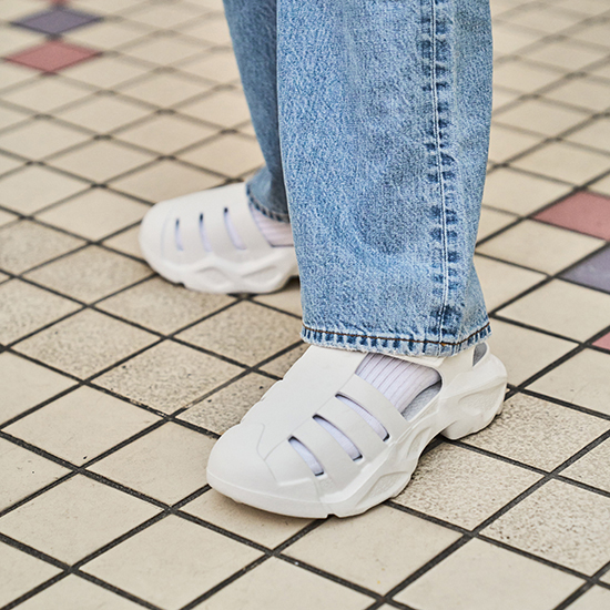 クッション性の高いEVAの厚底ソールが快適な歩行をサポートします。素足はもちろん靴下合わせも楽しめ、デイリーからアウトドアまで幅広いシーンで活躍する一足です。