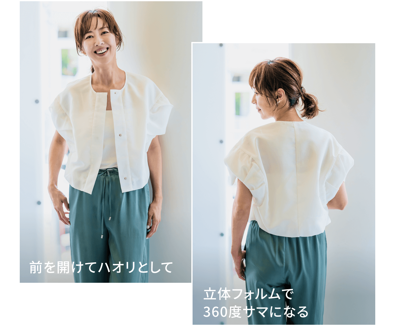 タンクトップなどにONするのはもちろん、ショート丈なのでワンピースやボトムスとも好バランス。秋へのスイッチアイテムとしても手元に置きたい一枚です。