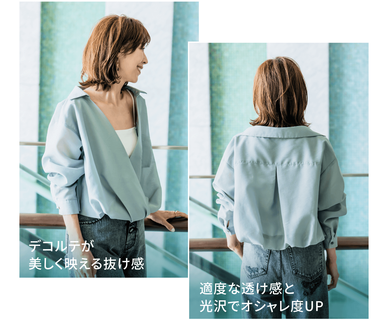 着るだけで立体的にラフな抜け感が生まれるカシュクールブラウス。大人世代ならではの削げた鎖骨を嫌味ない女っぽさで魅せるデザインです。適度な透け感とほんのりとした光沢が流行感と品を添えます。