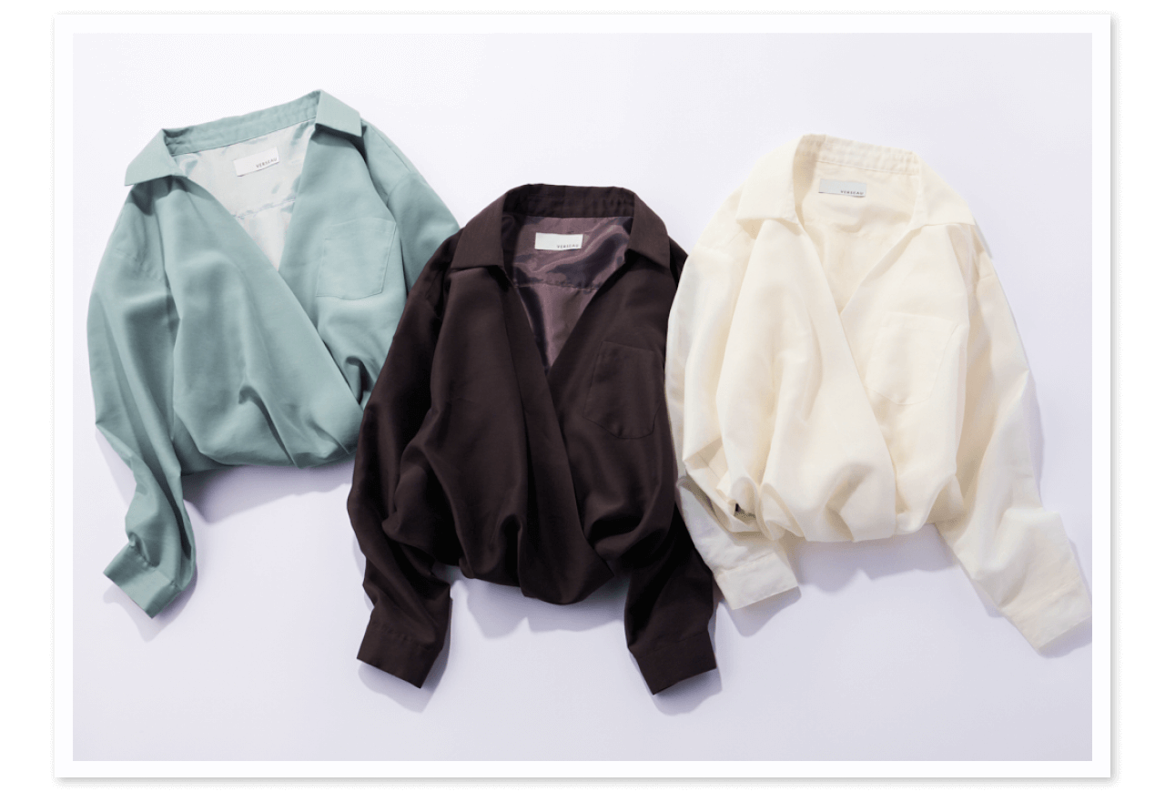 「肩で毛先が遊ぶレングスの髪だから、首から胸元にかけてのシルエットがスッキリ。大人の女性らしさを引き出してくれるブラウスです」