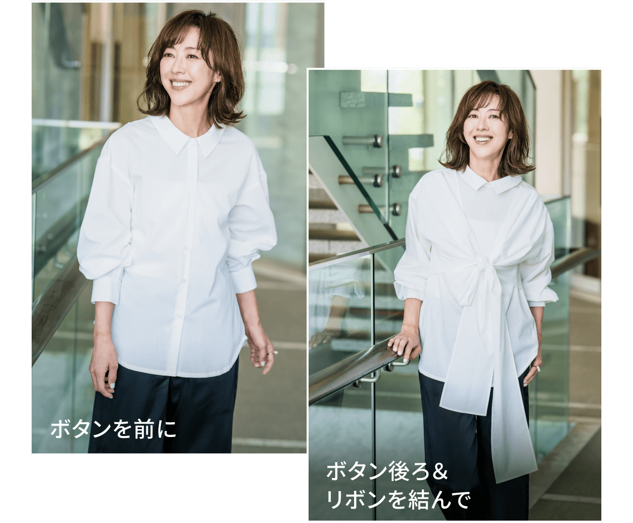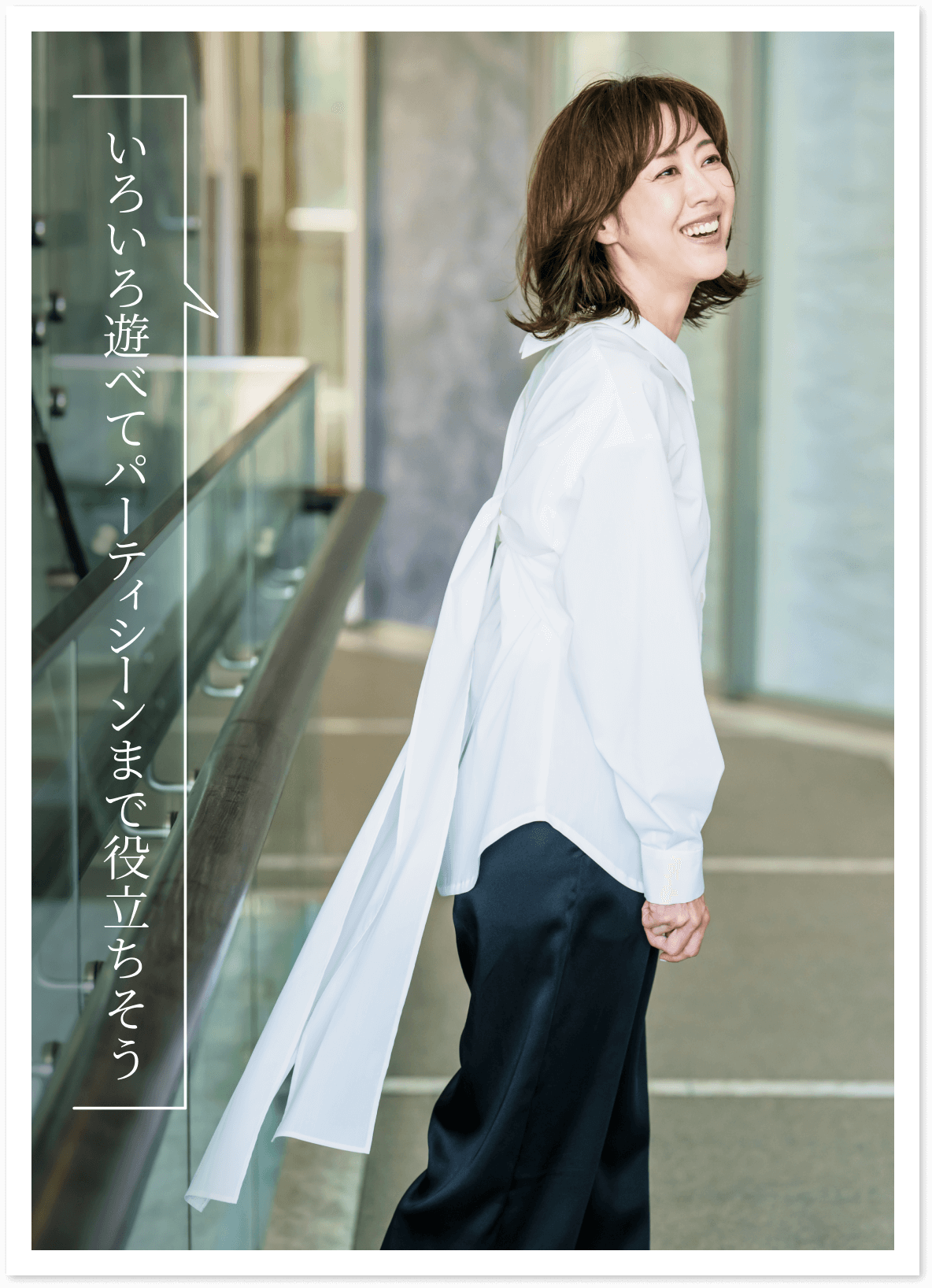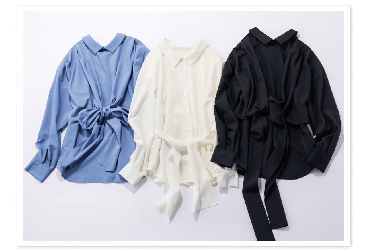 「ベースはシンプルながら、長めのデザインリボンでいろいろ遊べるシャツは、パーティシーンまで役立ちそう」
