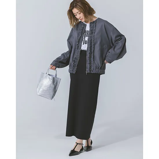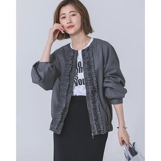 優待価格[Limue]【洗える】ノーカラーフリルブルゾン