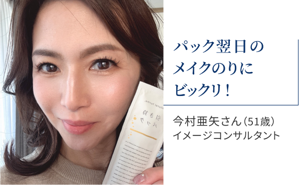 素肌が整ったのでファンデーションも厚塗りしなくてもよくなり、しかも毛穴レスに肌の表面が滑らかになったのでスーッと良く伸びるように。このパックを使いはじめてから3週間近く経つころヘアメイクさんにメイクをしていただく機会がありましたが、「肌の弾力とハリがすごい!
