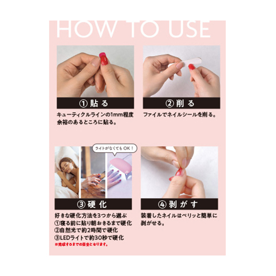 ●爪に油分や水分、汚れが付着しているとシールが剥がれやすくなりますので、爪の表面をキレイに拭き取ってください。