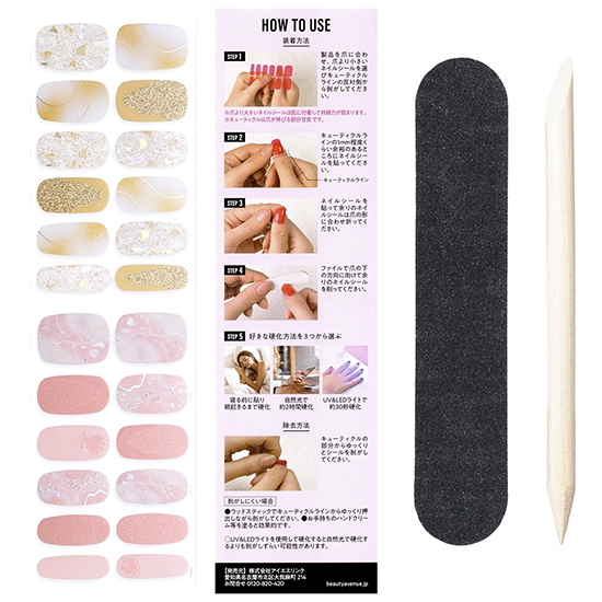 <p><font color=#c31941 size=3>AVENUEの新感覚ジェルネイルシールに春夏の新作デザインが追加。<br>LEDライト無しでも硬化。簡単!貼って剥がせるジェルネイルシール</font><br><br>■□■ 商品詳細 ■□■<br>■Aurora Fancy Beauty(オーロラファンシービューティー)<br>愛されピンクと落ち着いたゴールドで、純粋さと上品さをあわせ持った大人ネイル。<br><br>ジェルネイルの成分を約35%のみ硬化させた<br>貼って硬化するジェルネイルシール!<br><br>【こんな方におすすめ!】<br>□ 忙しいママの時短ネイルに<br>□ 旅行に行く時も簡単装着<br>□ 美容時間がない女性に<br>□ 突然のパーティーにも<br>□ 週末だけネイルを楽しみたい<br><br>■□■ 使用方法 ■□■<br>【ご使用前に】<br>●爪に油分や水分、汚れが付着しているとシールが剥がれやすくなりますので、爪の表面をキレイに拭き取ってください。<br>●甘皮を処理し、付属のファイルなどで爪の形や表面を整えるとよりキレイに仕上がります。<br>●シートからネイルシールを剥がす際にはシートの外側部分を持って剥がしてください。<br><br>【使用方法】<br>①製品を爪に合わせ、爪よりも少し小さめのネイルシールをお選びください。<br>②キューティクルラインと1㎜ほどの余裕のあるところにネイルシールを貼ってください。<br>③ネイルシールを貼って余りのネイルシールは爪の形に合わせて折ってください。<br> ファイルを利用して、爪の下の方向に向けて余りのネイルシールを削ってください。<br>④お好みの硬化方法を選んでください。<br>・寝る前に貼り硬化する場合<br>・自然光で硬化する場合:約2時間(自然光の多い室内と室外にて)<br>・UV&LEDライトで硬化する場合:約30秒<br><br>【剥がし方】<br>●ウッドスティックでキューティクルラインからゆっくり押し出しながら剥がしてください。<br>※剥がしにくい場合はお手持ちのハンドクリーム等を塗ると効果的です。<br> UV&LEDライトを使用して硬化すると自然光で硬化するよりも剥がしづらい可能性があります。<br><br>■□■ 使用上のご注意 ■□■<br>●本来の用途目的以外には使用しないでください。<br>●アレルギー体質の方、爪や爪付近の肌に異常があらわれた場合は、直ちにご使用を中止し、皮膚科専門医等にご相談ください。<br>●ネイルシールの持続時間には個人差があります。<br>●長時間の水仕事や入浴をした場合、剥がれやすくなります。<br>●開封後はなるべく早くご使用ください。<br>●長時間、連続しての使用は避けてください(一週間以内がお勧めです。)<br>●乳幼児の手の届かないところに保管してください。<br>●火気の近くや直射日光の強く当たるところ、高温になる場所には置かないでください。<br><br>■□■ 製造国 ■□■<br>韓国製</p>